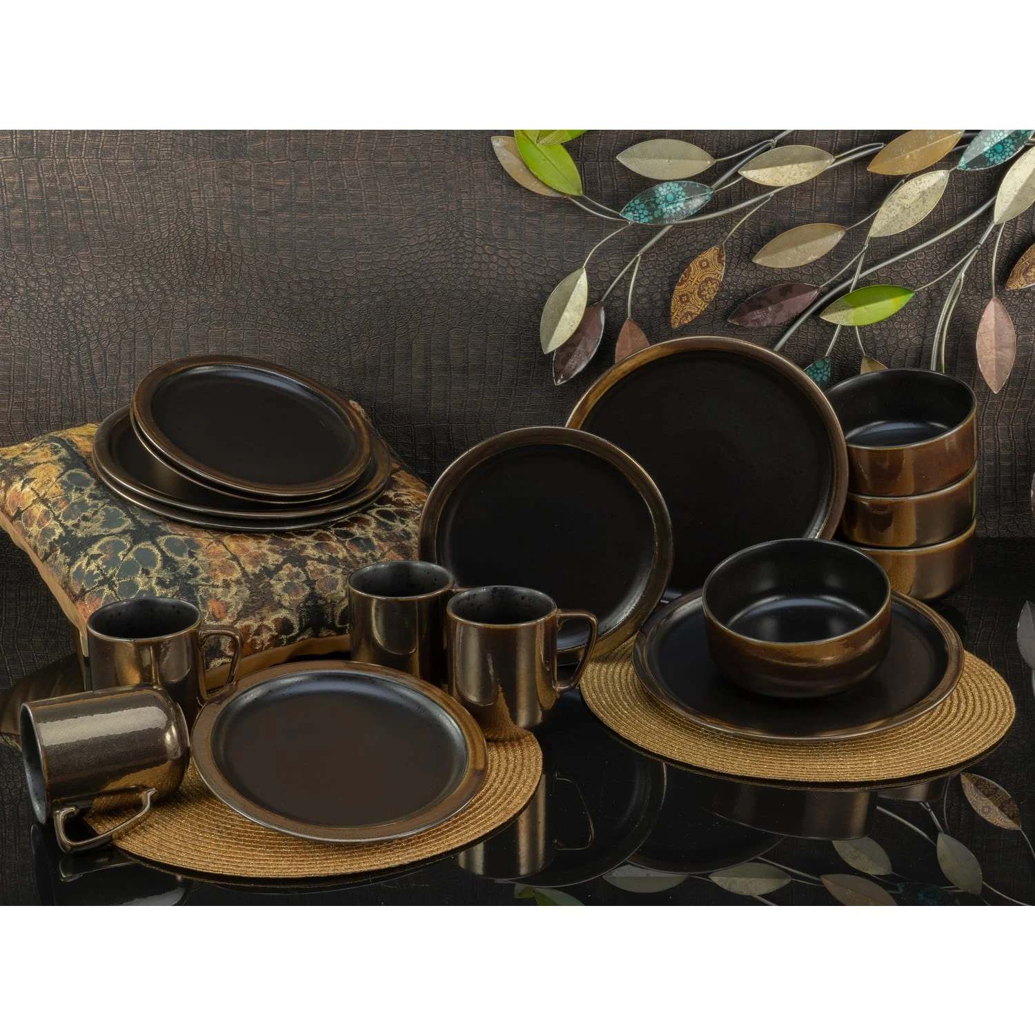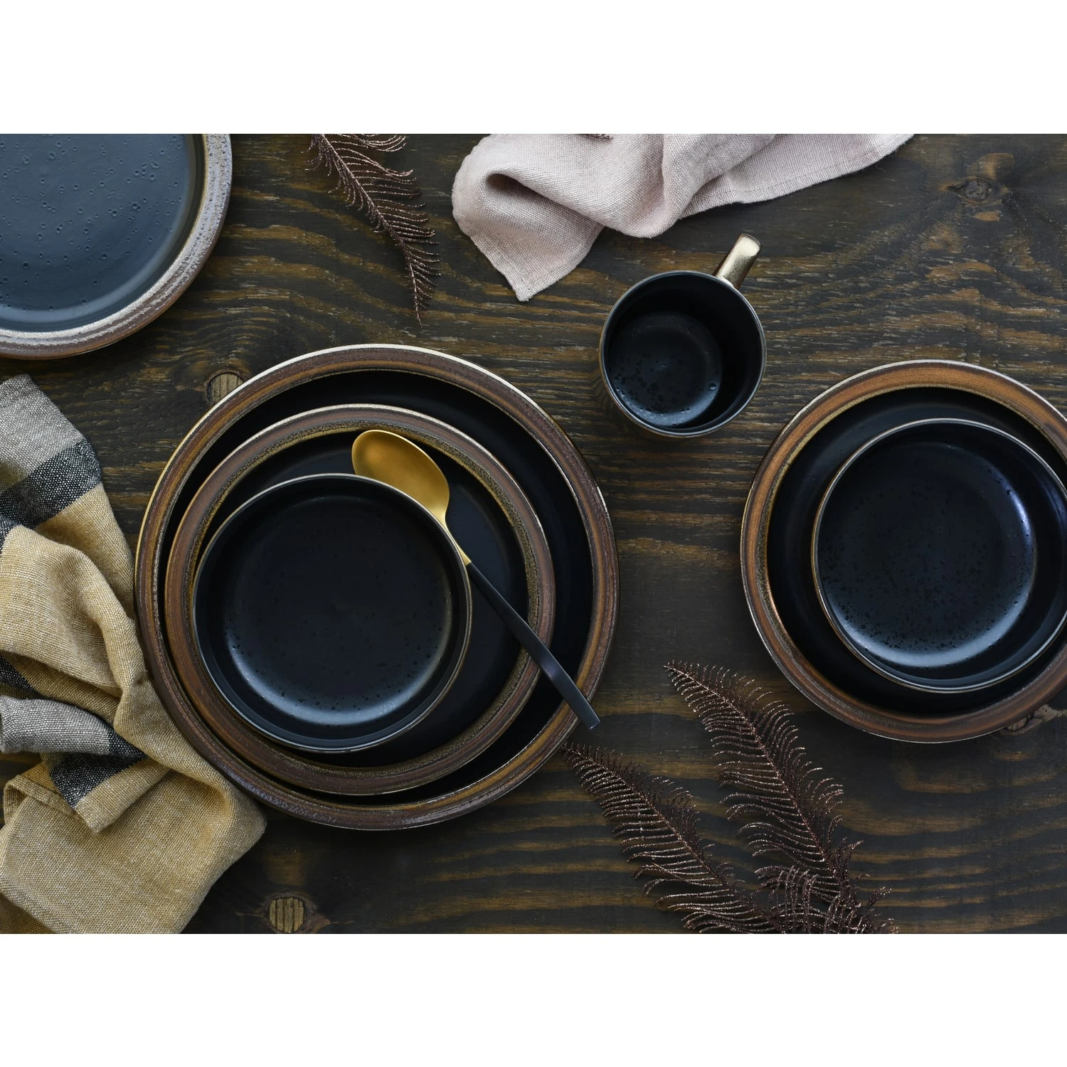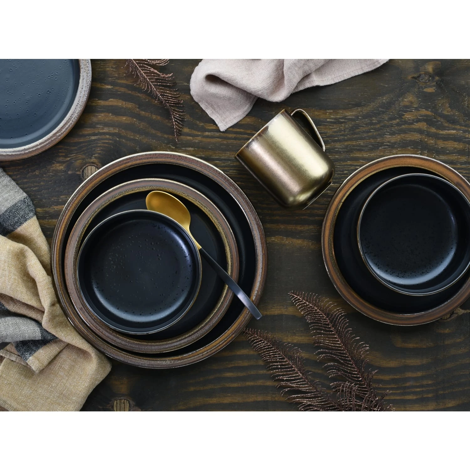 Das Geschirr präsentiert sich mit einer Spezialglasur in schwarz mit glänzenden Sprenkeln. Die Fahnen und die Außenseiten wurden mit einer hochwertigen goldfarbenen Glimmer Glasur versehen. Insgesamt eine topaktuelle Form mit großem Spiegel und schmaler Tellerfahne!