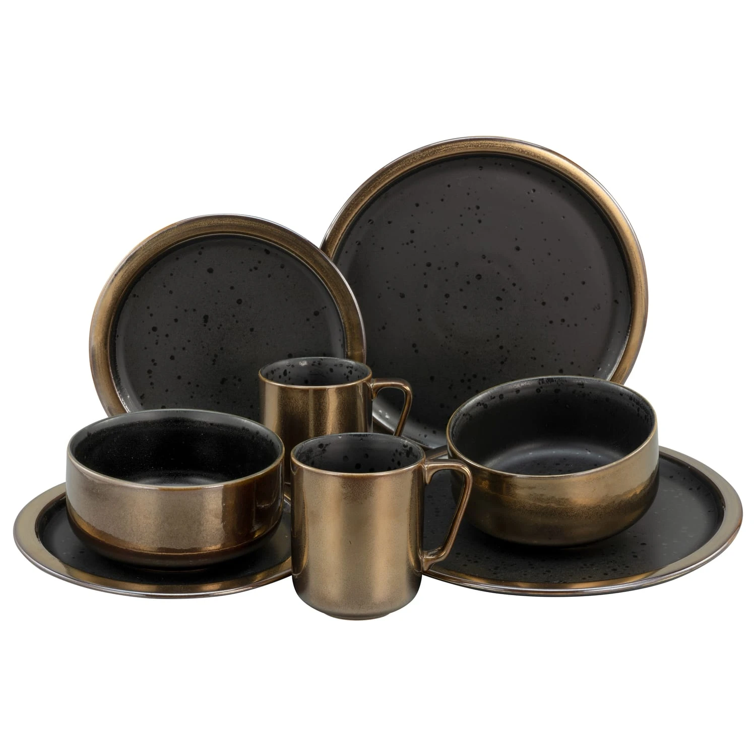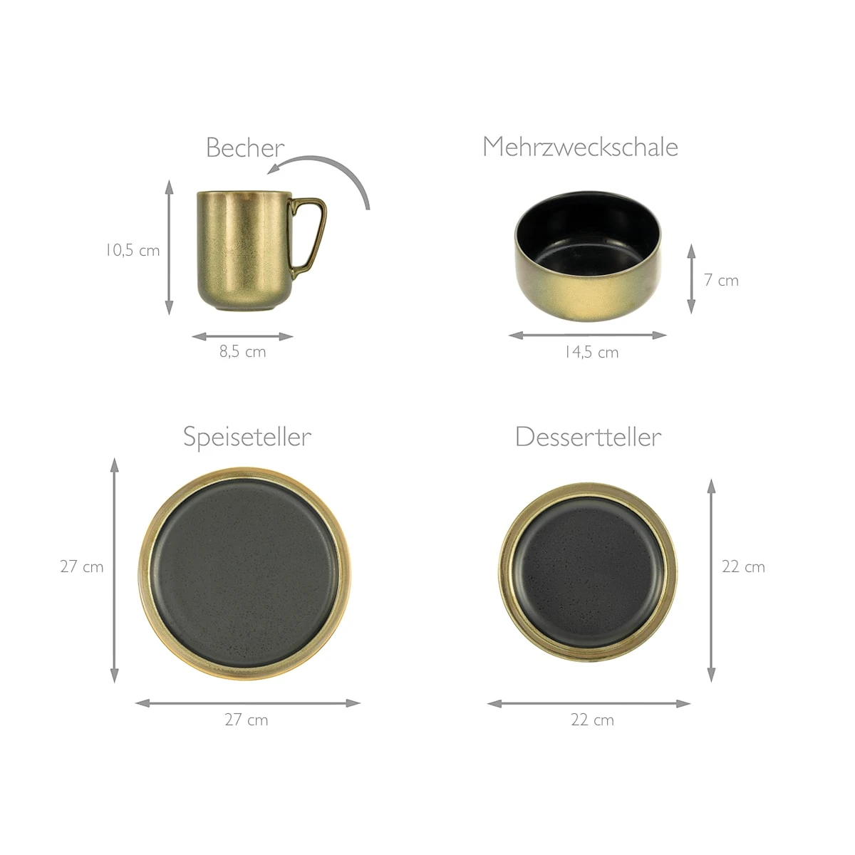 Das Geschirr präsentiert sich mit einer Spezialglasur in schwarz mit glänzenden Sprenkeln. Die Fahnen und die Außenseiten wurden mit einer hochwertigen goldfarbenen Glimmer Glasur versehen. Insgesamt eine topaktuelle Form mit großem Spiegel und schmaler Tellerfahne!