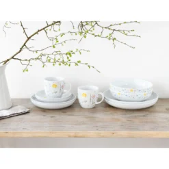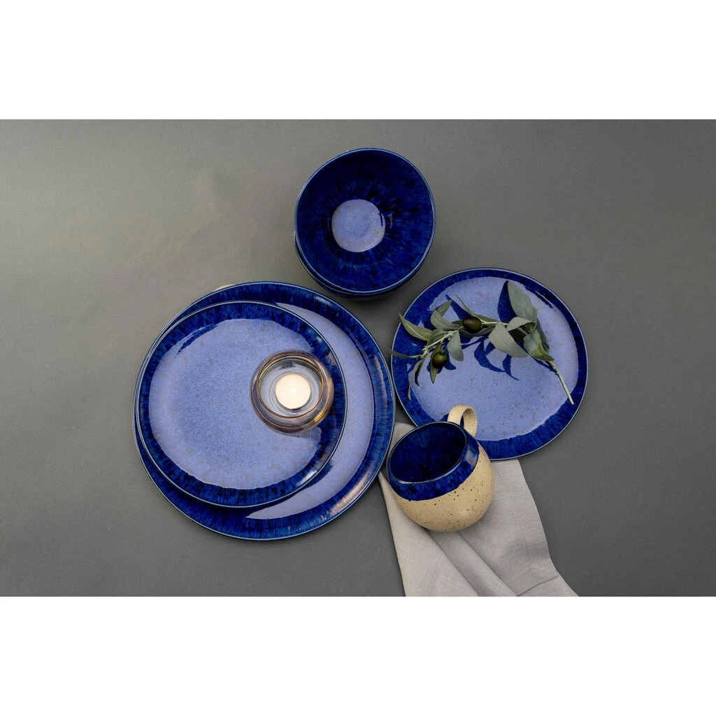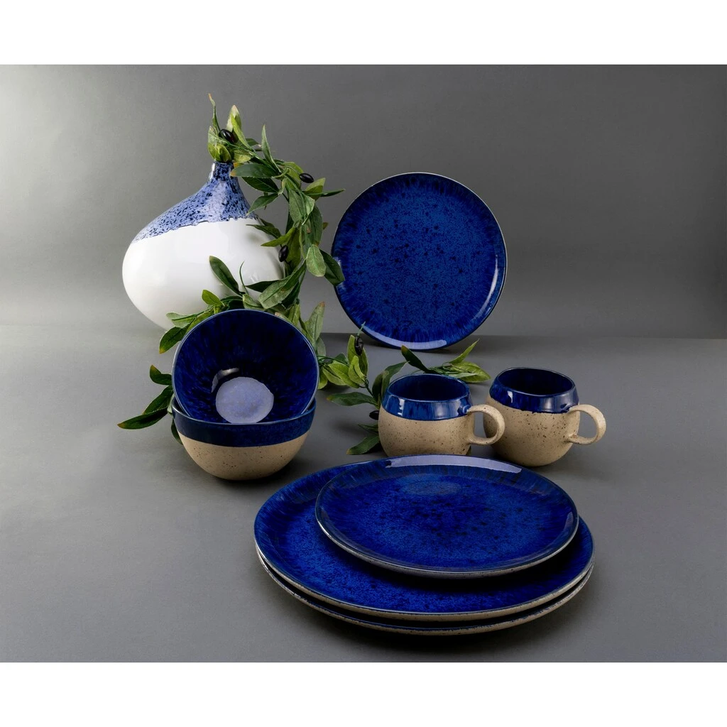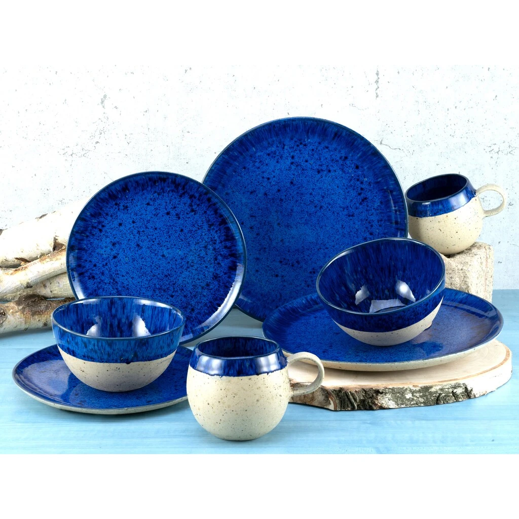 Das Geschirr präsentiert sich in einer topaktuellen organischen Form als Kombination von „Sand Matt“ und „Tiefblau glänzend“. Dazu verleihen die diversen Sprenkel und Einschlüsse dem Service einen individuellen „Handmade“ Charakter, d.h. jedes Stück ist ein Unikat.