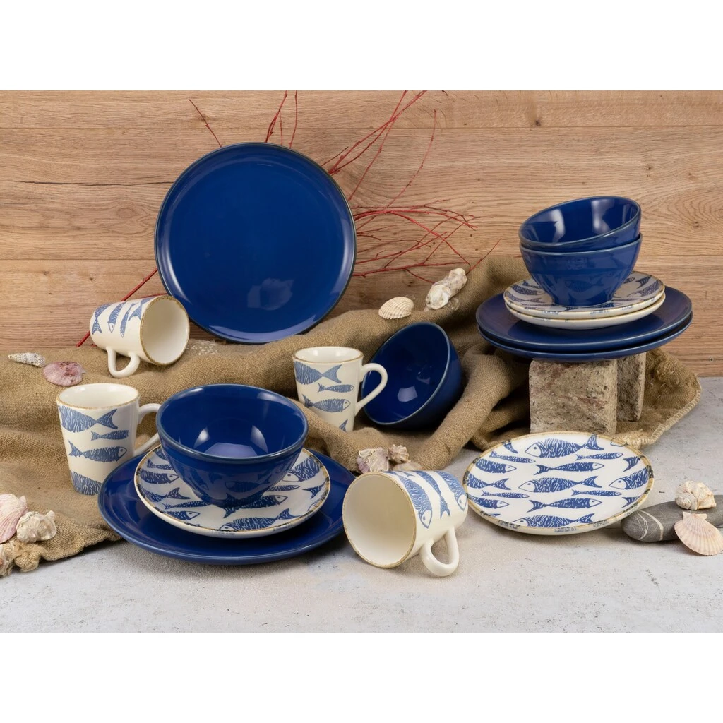 Suchst du ein außergewöhnliches Geschirr? Das Kombiservice Faro aus dem Hause CreaTable ist perfekt dafür! Das Dekor mit Fischen als Stempeldruck aufgebracht, mit dem Mix aus tiefdunklem, intensiven Blau ist etwas Besonderes auf jeder Tafel. Zudem ist das Geschirr für deine Mikrowelle und Spülmaschine geeignet.