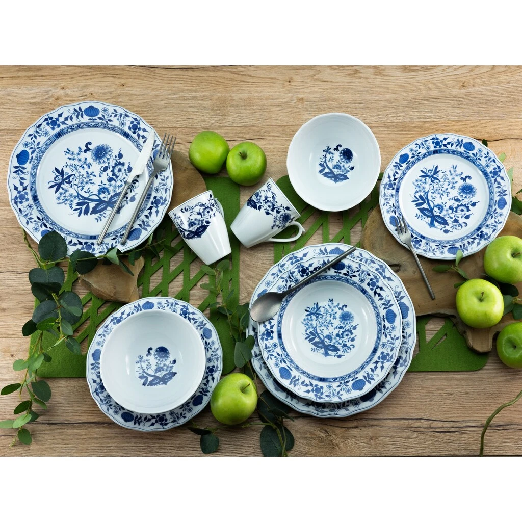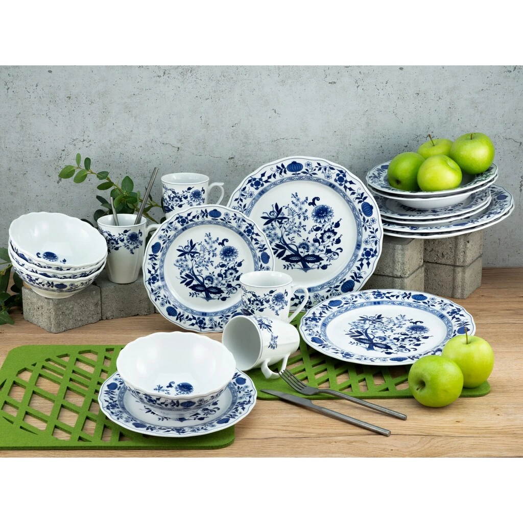 Die fein gearbeitete klassische Zwiebelmuster Dekoration präsentiert sich als Mittelpunkt einer jeden festlichen Tafel. Durch traditionelle Form im nostalgischen Manufakturstil überzeugt das Geschirr mit Eleganz und Zeitlosigkeit.