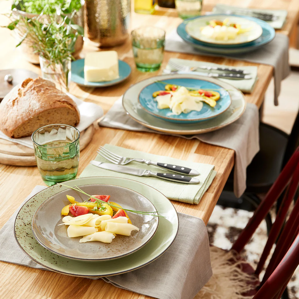 CREATABLE Kombiservice »Nature Collection«, 20-teilig aus hochwertigem Steinzeug in hochaktueller Coupeform mit sortierten Naturglasuren. Die Farben Steingrau, Wasserblau, Naturgrün und Sand stellen die Elemente Stein, Wasser, Flora und Erde dar. Der handwerkliche Look in Kombination mit den Naturfarben und Sprenkeln liegt voll im Trend und passt perfekt in den Vintage-Style (Leichte Farbunterschiede möglich). Spülmaschinen- und mikrowellengeeignet. Das 20-teilige Kombiservice »Nature Collection« von Creatable besteht aus: 4 Speiseteller Ø 27 cm, 4 Suppenteller Ø 21 cm, 4 Dessertteller Ø 21 cm, 4 Kaffeetassen 20 cl, 4 Untertassen Ø 15 cm.