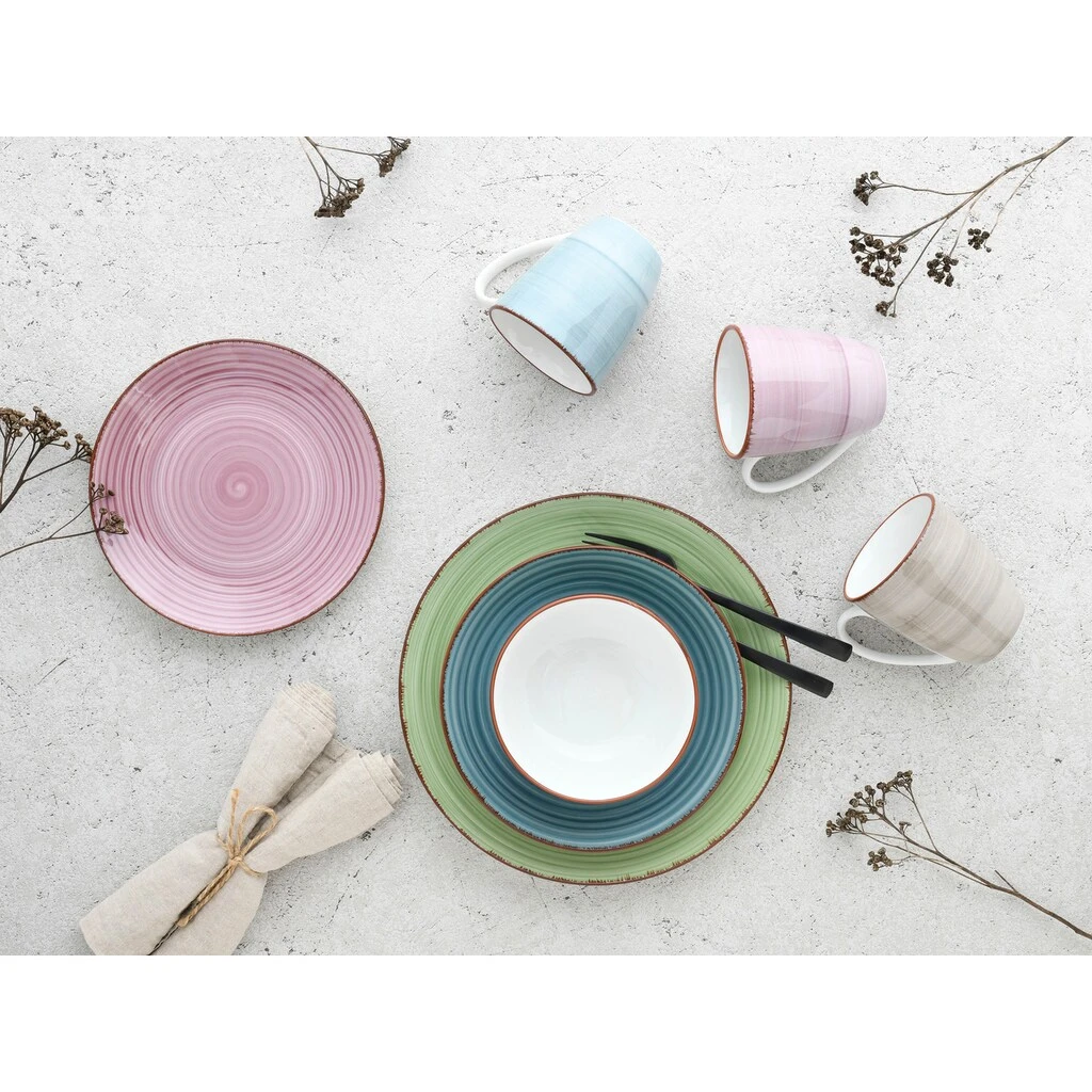 Das Set aus Porzellan präsentiert sich in einer fein gearbeiteten Optik. Durch die besondere Verarbeitung wirkt es wie Steinzeug oder Steingut. Der handgemalte Spiral Dekor in den 4 Farben blau, beige, rosa und mint besticht auch durch seine glänzende, gebrannte Unterglasur in Verbindung mit einem ebenfalls handgemalten Aussenrand. SAMBA: Da tanzt der Tisch!
