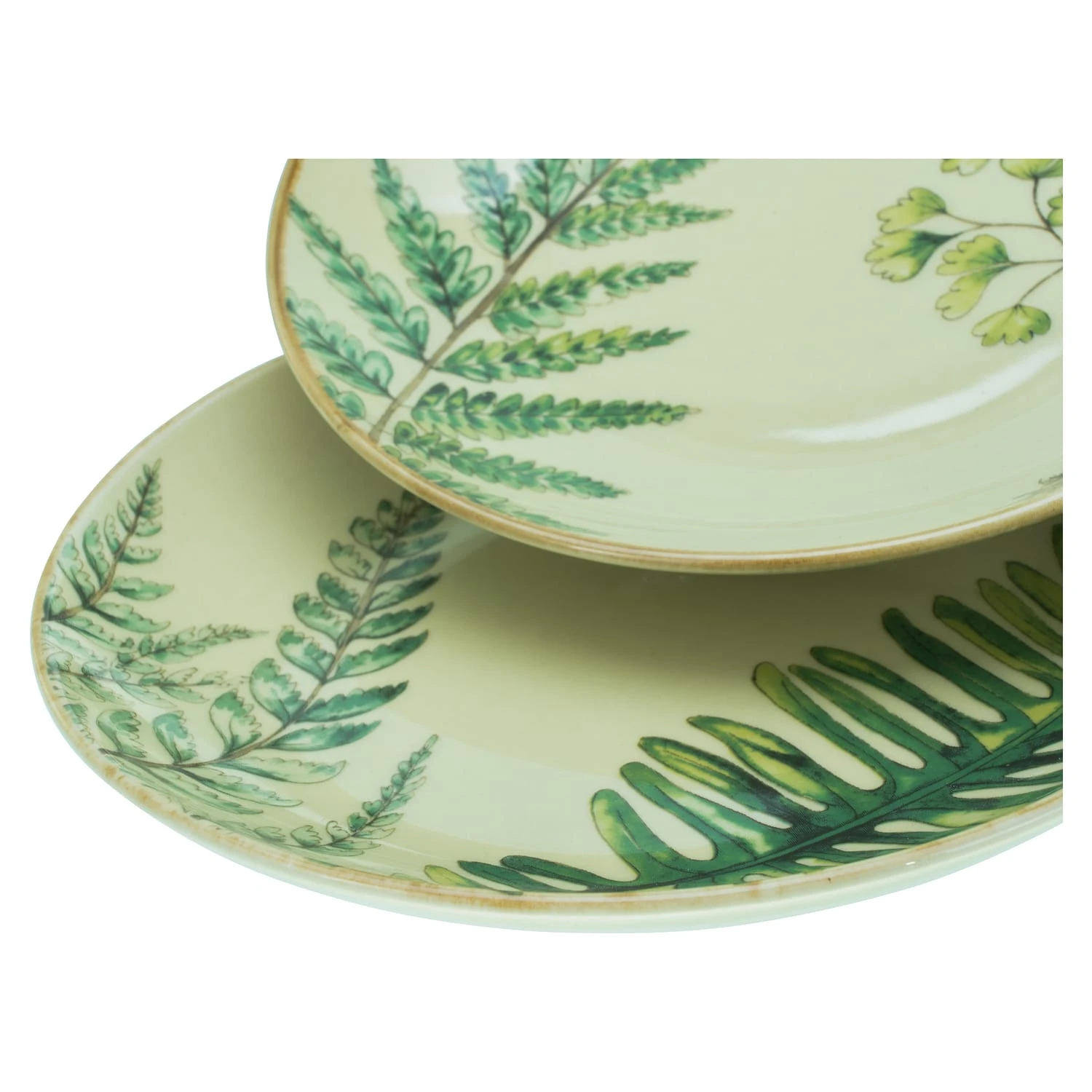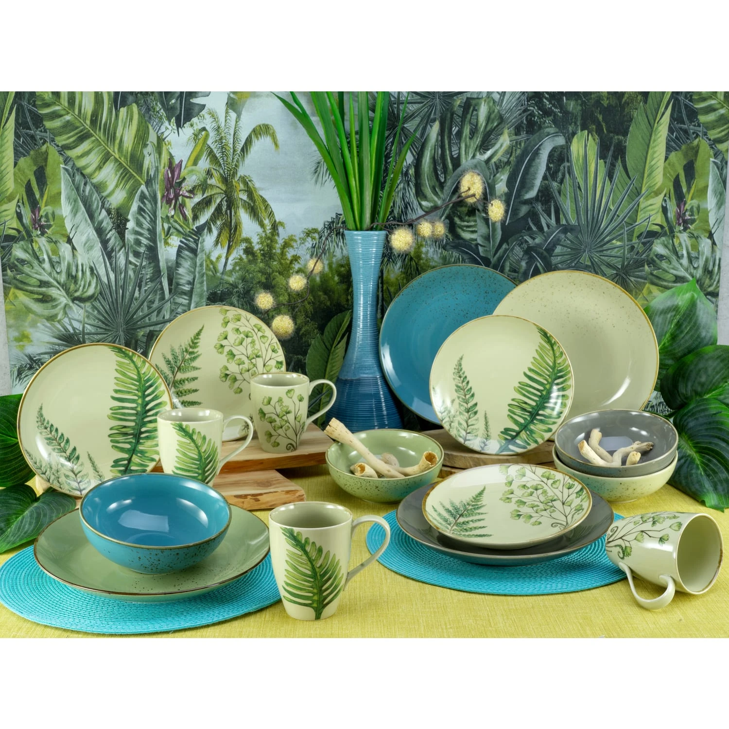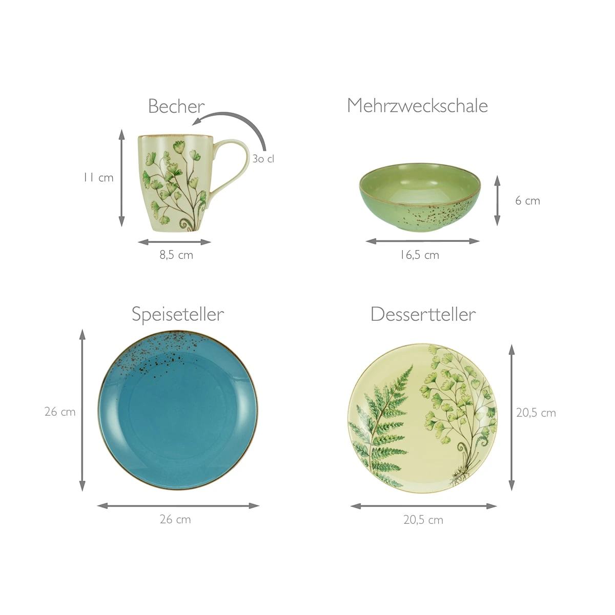 Das hochwertige Steinzeug präsentiert sich in einer hochaktuellen Coupeform mit Naturfarben in Grün, Sand, Stein und Petrol sowie2 Blattmotive in Farn Optik.