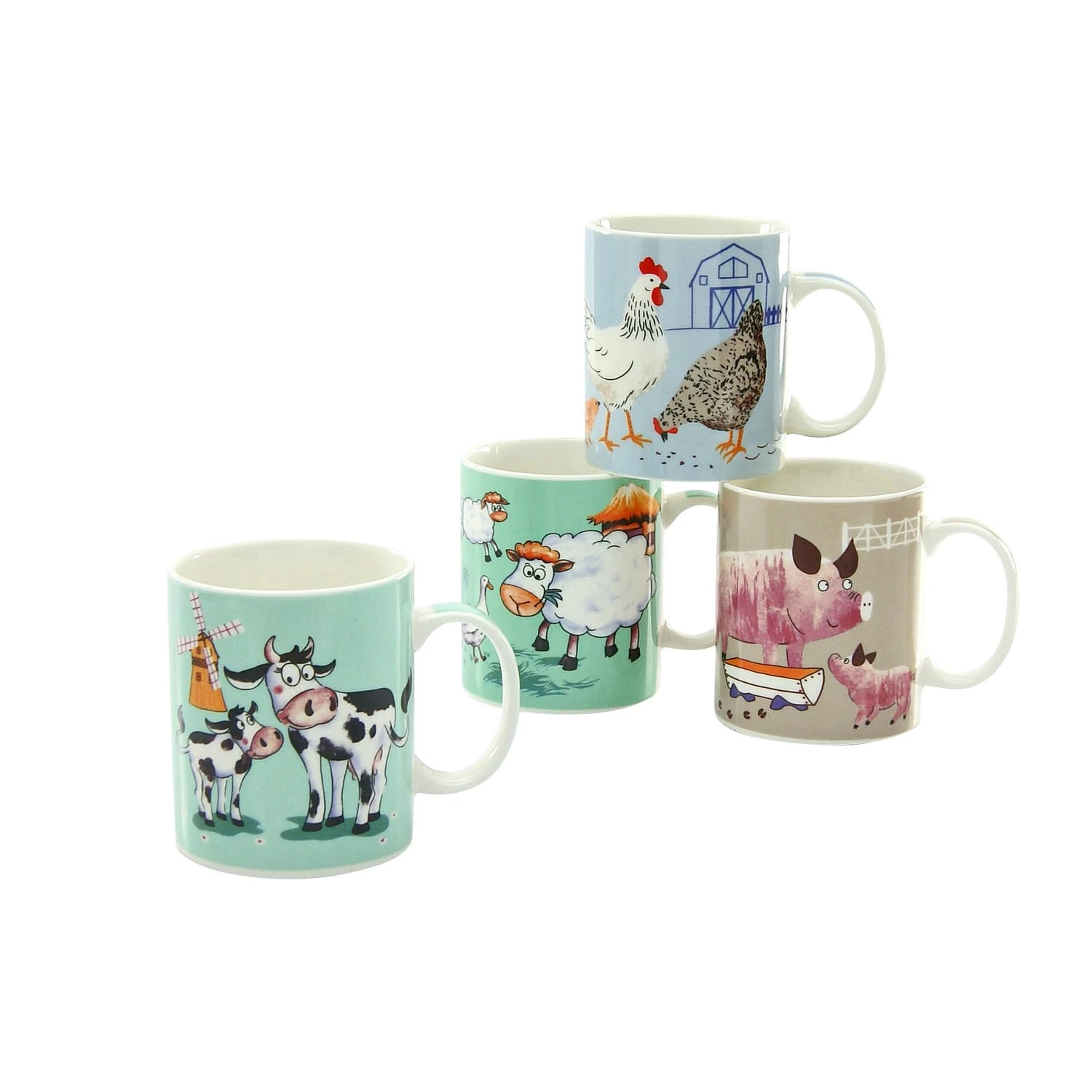 Die extrabreiten, zylindrischen Becher mit einem Fassungsvermögen von je 30 cl präsentieren sich in lustigen Bauernhof Motiven „Kuh, Schwein, Schaf und Huhn“.