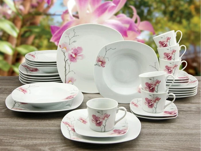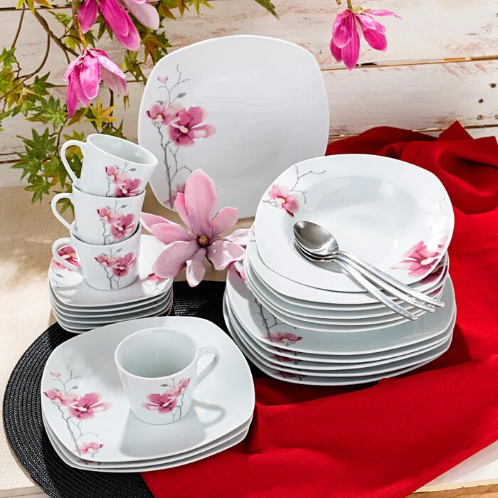 - Je 6 Frühstücksteller 20 cm, Kaffeetassen 200 ml, Kaffeeuntere 14 cm, Speiseteller 26 cm, Suppenteller 21 cm