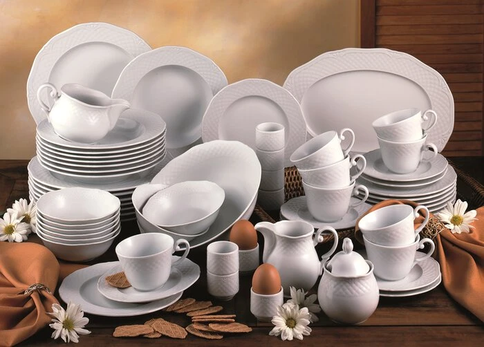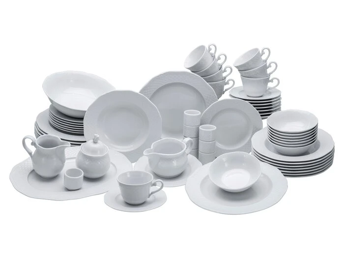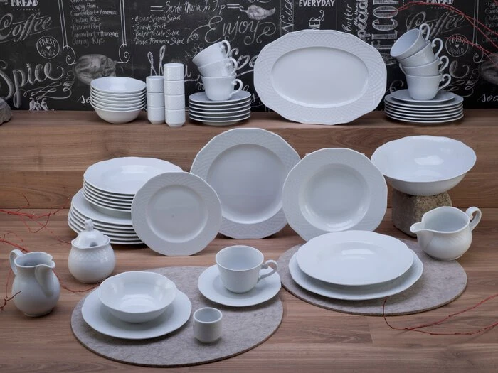 - Je 6 Speiseteller 29 cm, Suppenteller 24 cm, Frühstücksteller 24 cm, Kaffeetassen 220 ml, Kaffeeuntere 14,5 cm