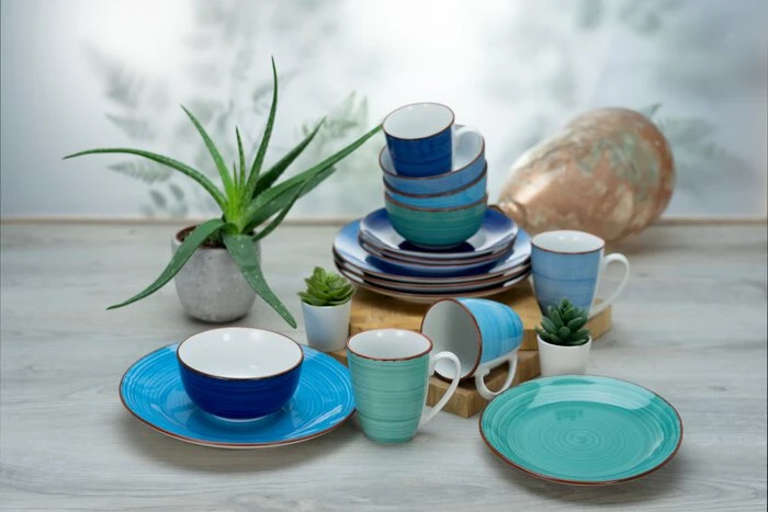 - Je 4 Speiseteller Ø 26,5 cm, Desserteller Ø 19 cm, Kaffeebecher 300 ml, Müslischale Ø 14 cm