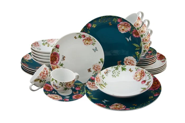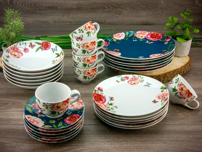 - Je 6 Speiseteller 28 cm, Suppenteller 22 cm, Frühstücksteller 21 cm, Kaffeetassen 220 ml, Kaffeeuntere