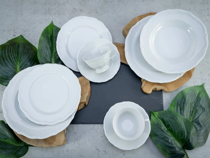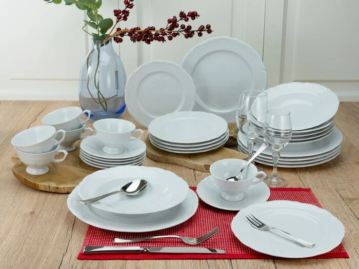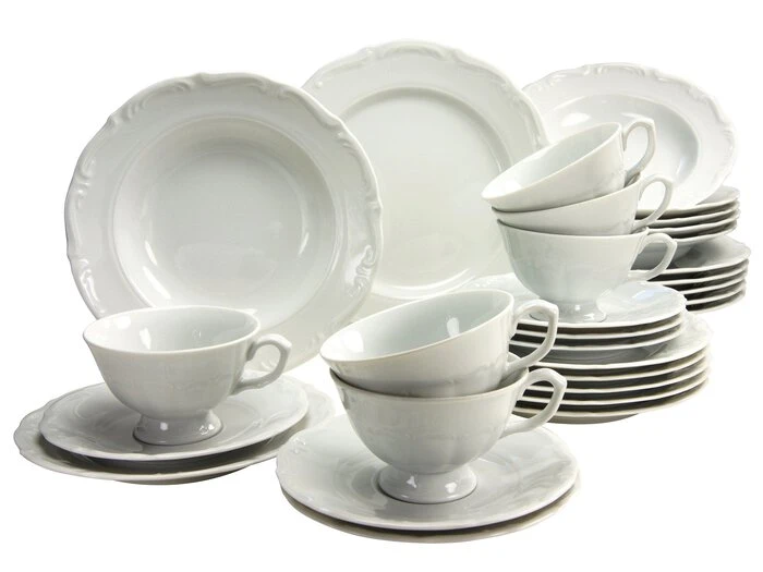 - Je 6 Speiseteller 25 cm, Suppenteller 22 cm, Frühstücksteller 19 cm, Kaffeetasse 200 ml, Kaffeeuntere 14 cm